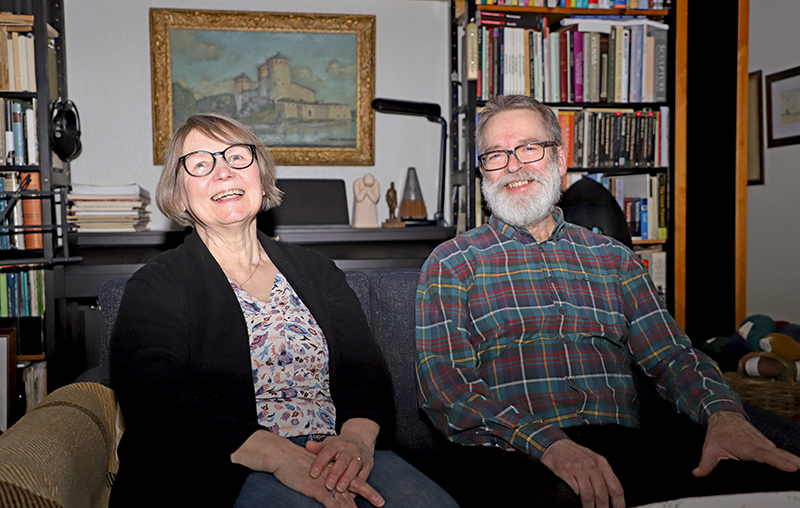 Liisa on kirjaston aktiivikäyttäjä ja Olkkarilla Enqvistit ovat käyneet jo pari kertaa. Viime kerralla kanttorin ollessa estynyt musikaalinen Petri säesti virsiä pianolla ihan extempore.