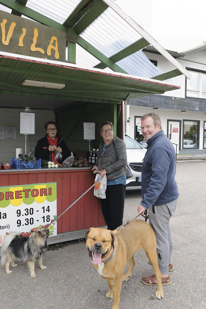 Evolla mökkeilevät Sinikka ja Ilkka Repo sekä Essi- ja Pulmu-koira poikkesivat torilla. Mukaan tarttui perunoita ja sipuleita.