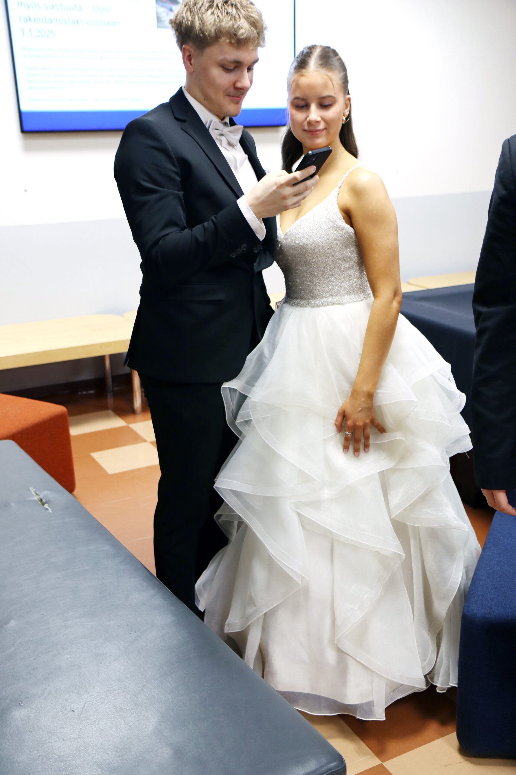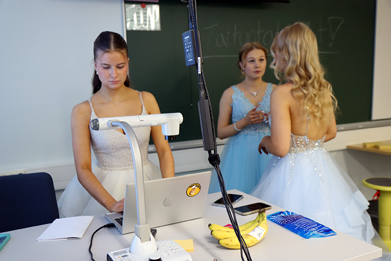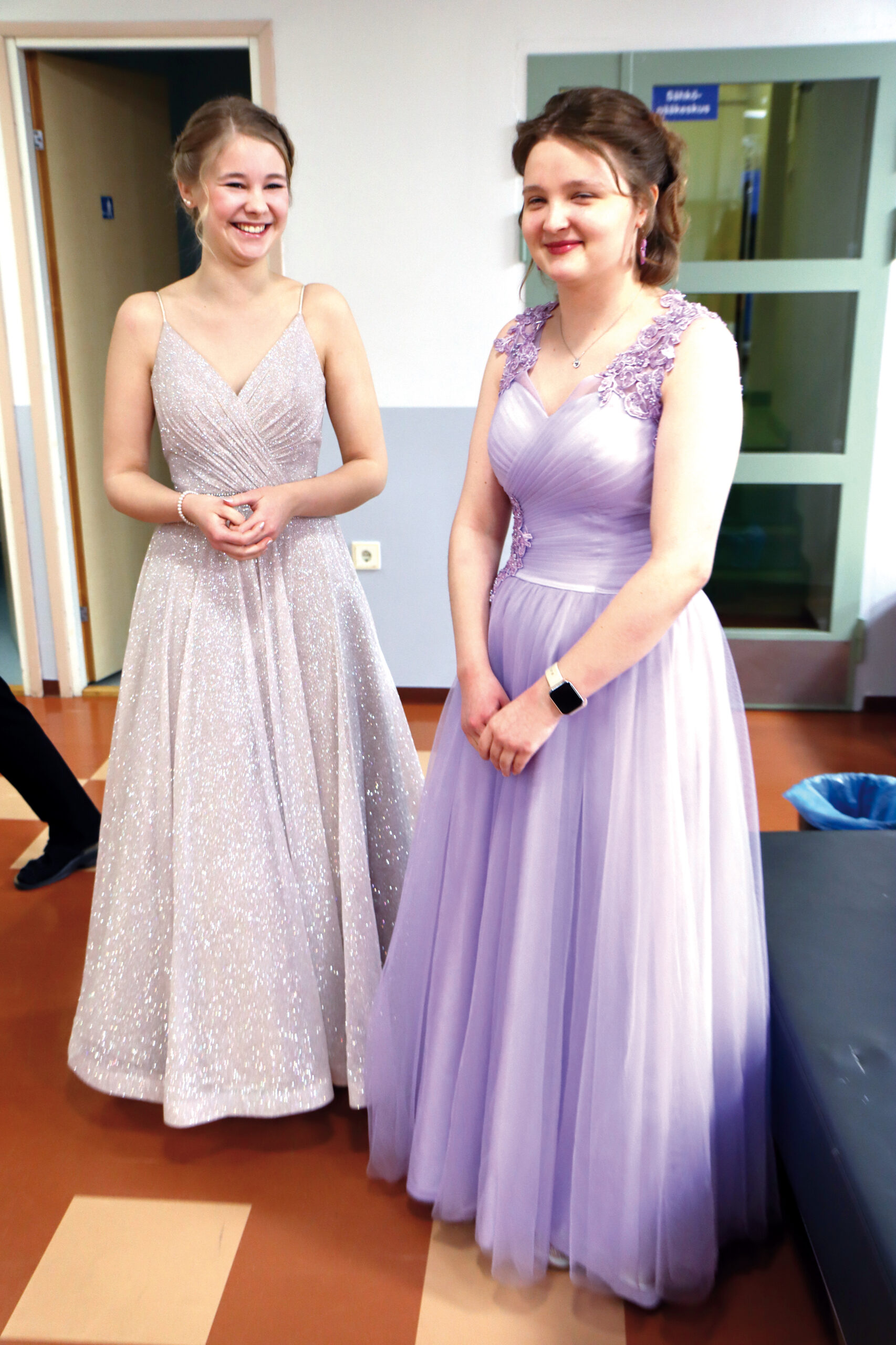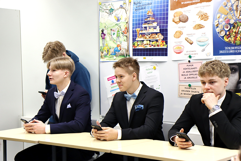 Parhaimpiinsa pukeutuneena he ottivat Pappilanmäen koulun ala-aulassa kätellen vastaan opettajat ja oppilaat. Parhaillaan on menossa Wanhojen tanssiesitys salissa koulun väelle. Seniorit käyvät esiintymässä myös Visapuiston ja Pihlajakodin asukkaille. Wanhojen tanssi -yleisötilaisuus alkaa klo 18 Pappilanmäen koululla.